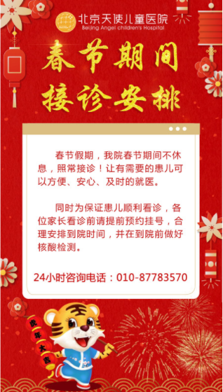 辞旧迎新过大年,万家灯火送祝福!在这阖家团聚的时刻,北京天使儿童医院院长戈光辉携全体员工向所有儿童及家属致以节日的问候和真挚的祝福,祝您在新的一年里,虎年大吉,虎虎生威,新春快乐,阖家幸福,平平安安,健健康康!