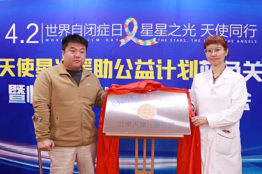北京市肢残人协会创业就业部郭兴元主任与北京天使儿童医院代表共同为“天使星光援助”公益计划揭牌,并向贫困家庭自闭症患儿捐赠治疗费用。