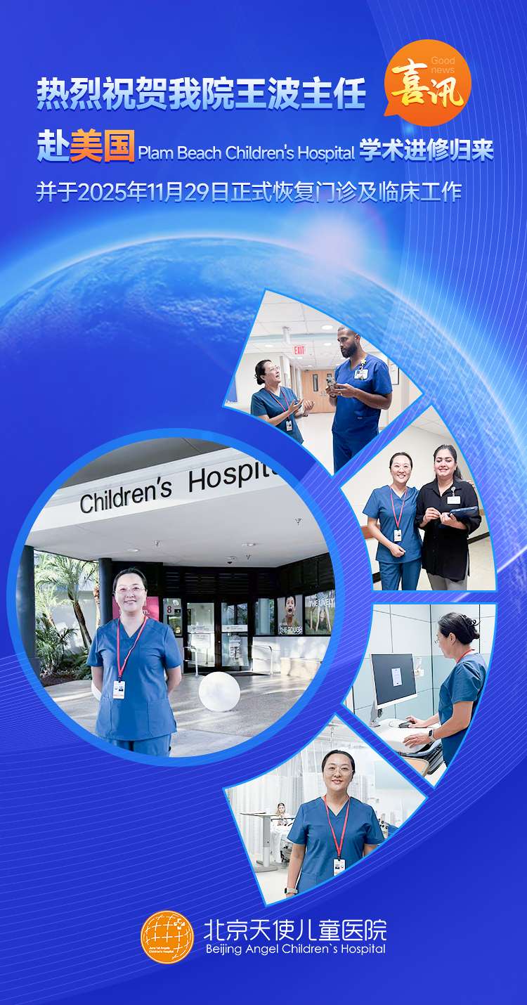跨越太平洋的医学求索,终以硕果回馈初心。历经 2024-2025 年度的潜心深造,北京天使儿童医院王波主任在世界知名儿科医疗机构 —— 美国 Plam Beach Children's Hospital 的进修之旅圆满落幕。带着国际前沿的诊疗技术与人文服务理念,王波主任将于 11 月 29 日正式重返临床岗位,为广大患儿带来更高质量、更具温度的医疗服务,为科室发展注入全新动能。